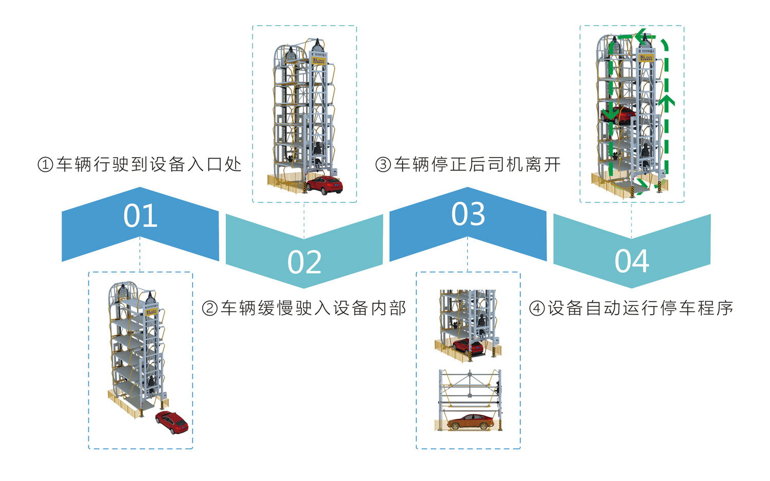 1.每層搬運器和升降機分別動作,互不干擾,提高了車輛出入庫的速度